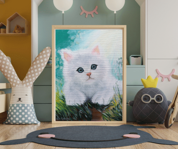 A festészet és a mesék találkozása a képzeletbeli világokat kelti életre, ahol a színek és formák történeteket mondanak el. A Bájos cica festmények kifejezetten a gyerekek fantáziavilágára épít, élénk kék, a selymes fehér színnel és egyszerű formákkal. Az alkotás hidat képez a vizuális élmény és az elbeszélés között, lehetőséget adva a szemlélődőnek, hogy a saját képzeletével fejezze be a történetet.