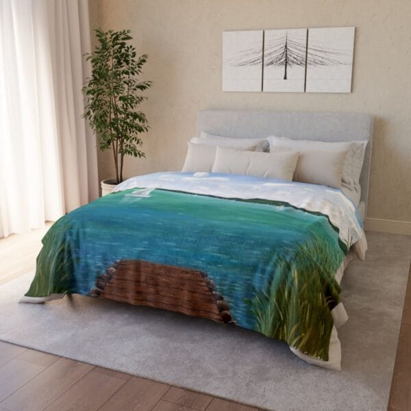 Ha még a festőművészet elkötelezett hívei is vagyunk, akkor a legjobb választás Vida Gabriella festőművész alkotásainak plédre nyomott változatai. Ennek a plédnek az eredeti változata Vida Gabriella Balaton stéggel című alkotása.
