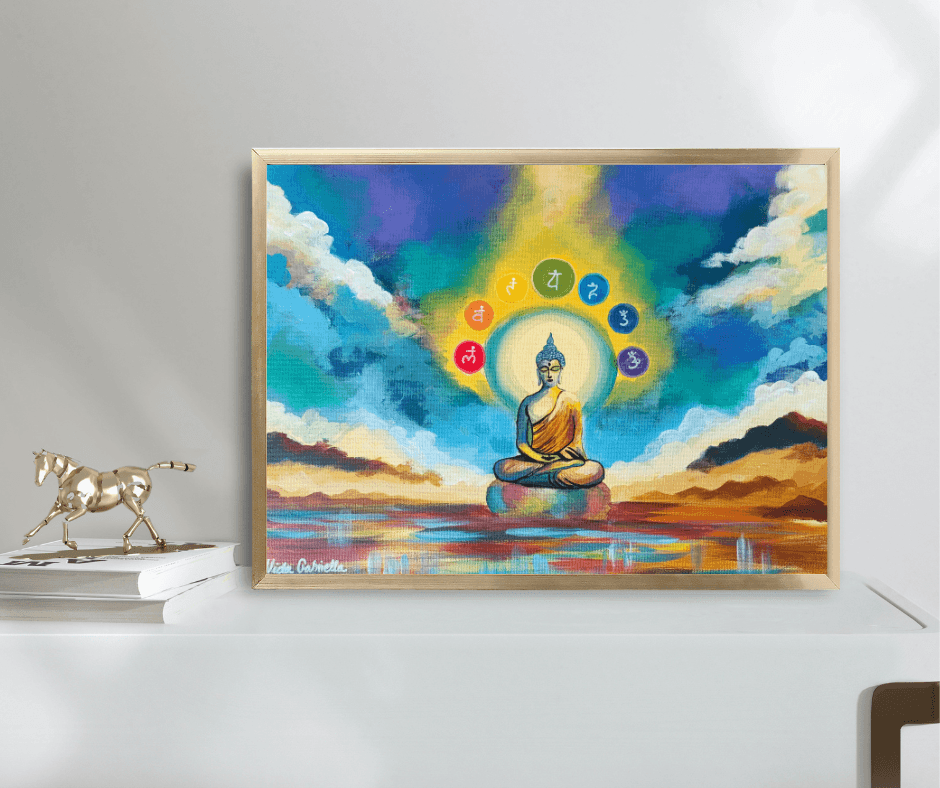 Elvont Buddha festmény. Gondolatiság ábrázolása , a szárnyaló szellem megjelenítése , egy ima keretbe zárása.