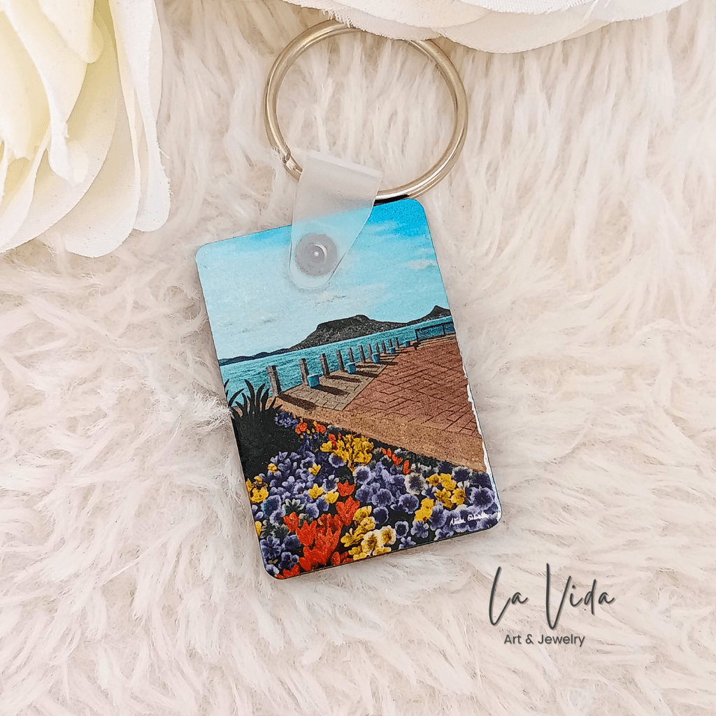 Egyedi kézműves termék Vida Gabriella Fonyód árvácskával festménye kulcstartóra nyomtatva.