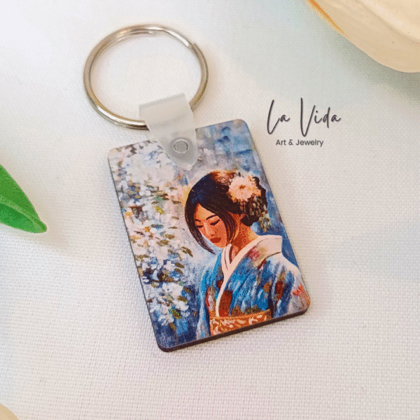 A kulcstartó két oldalas, mindkét oldalon Vida Gabriella festőművész Gésa című alkotását ábrázolja.