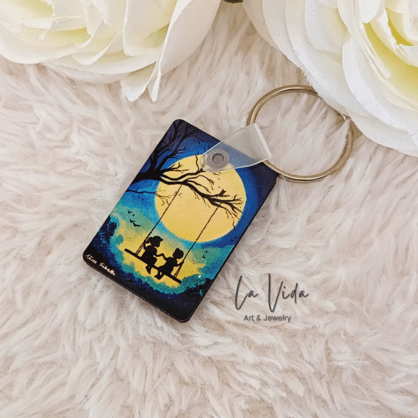A kulcstartó két oldalas, mindkét oldalon Vida Gabriella festőművész Testvéri szeretet című alkotását ábrázolja.