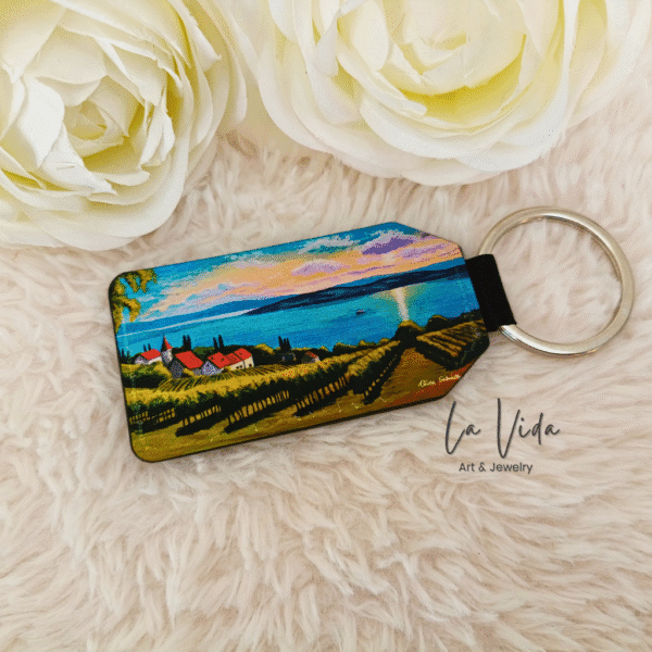 Egyedi kézműves termék Vida Gabriella Balatoni panoráma festménye műbőr kulcstartóra nyomtatva.