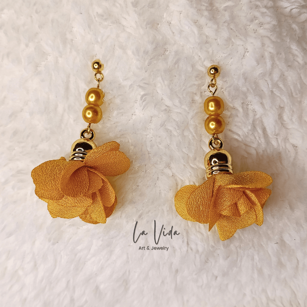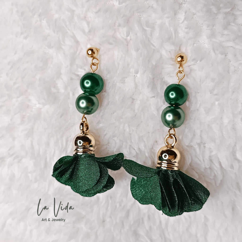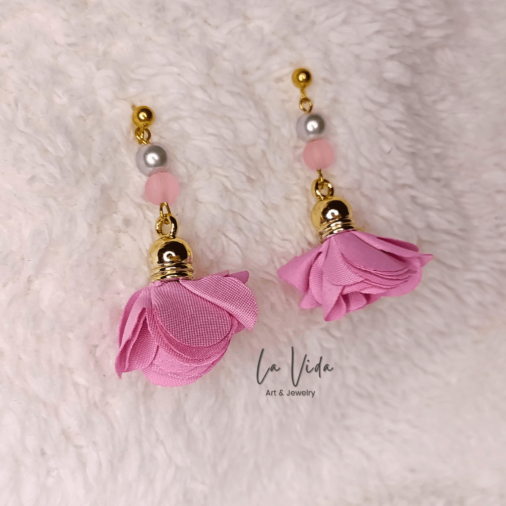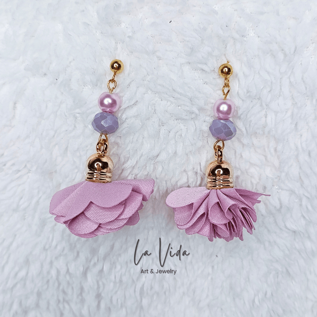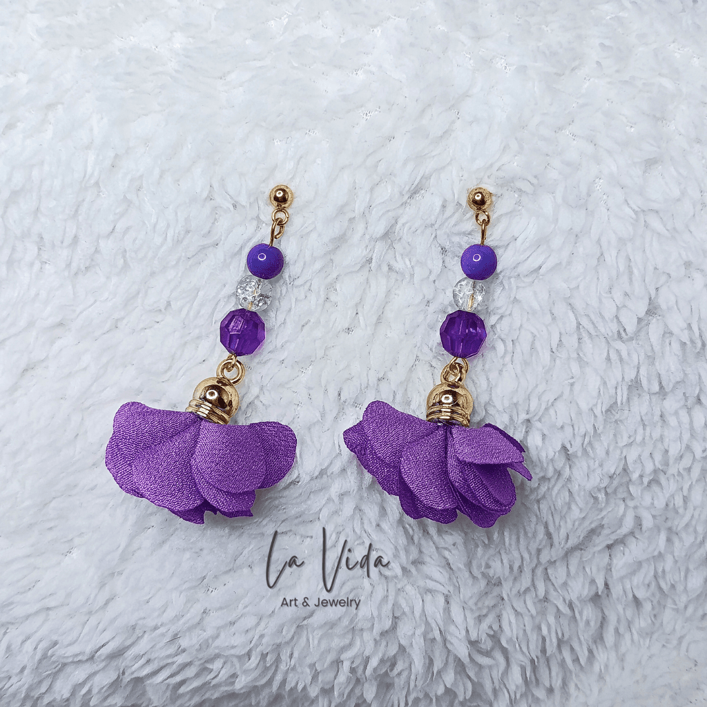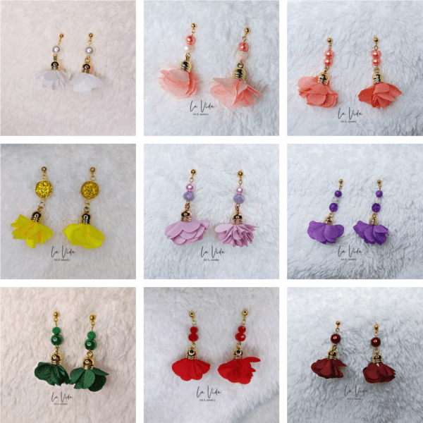 Ezek a fülbevalók virágbojtokkal és üveggyöngyökkel készültek.