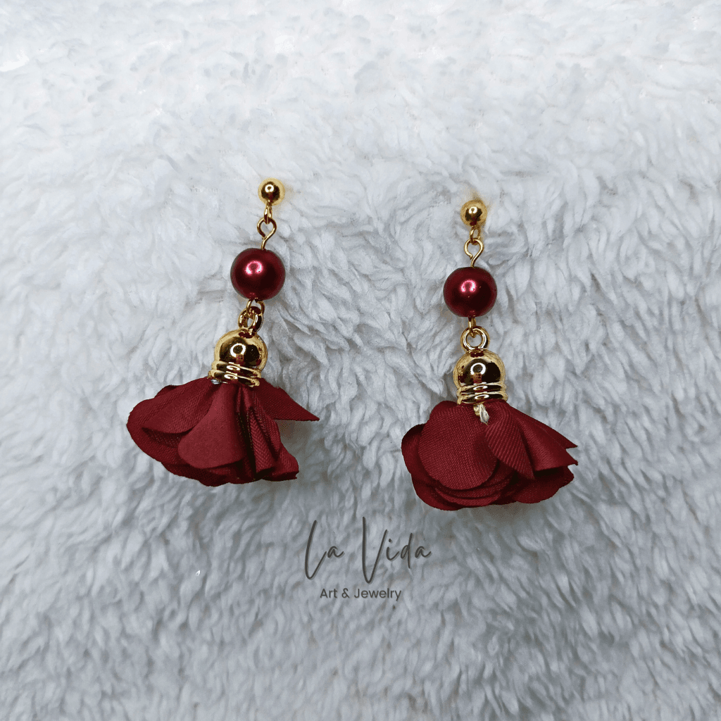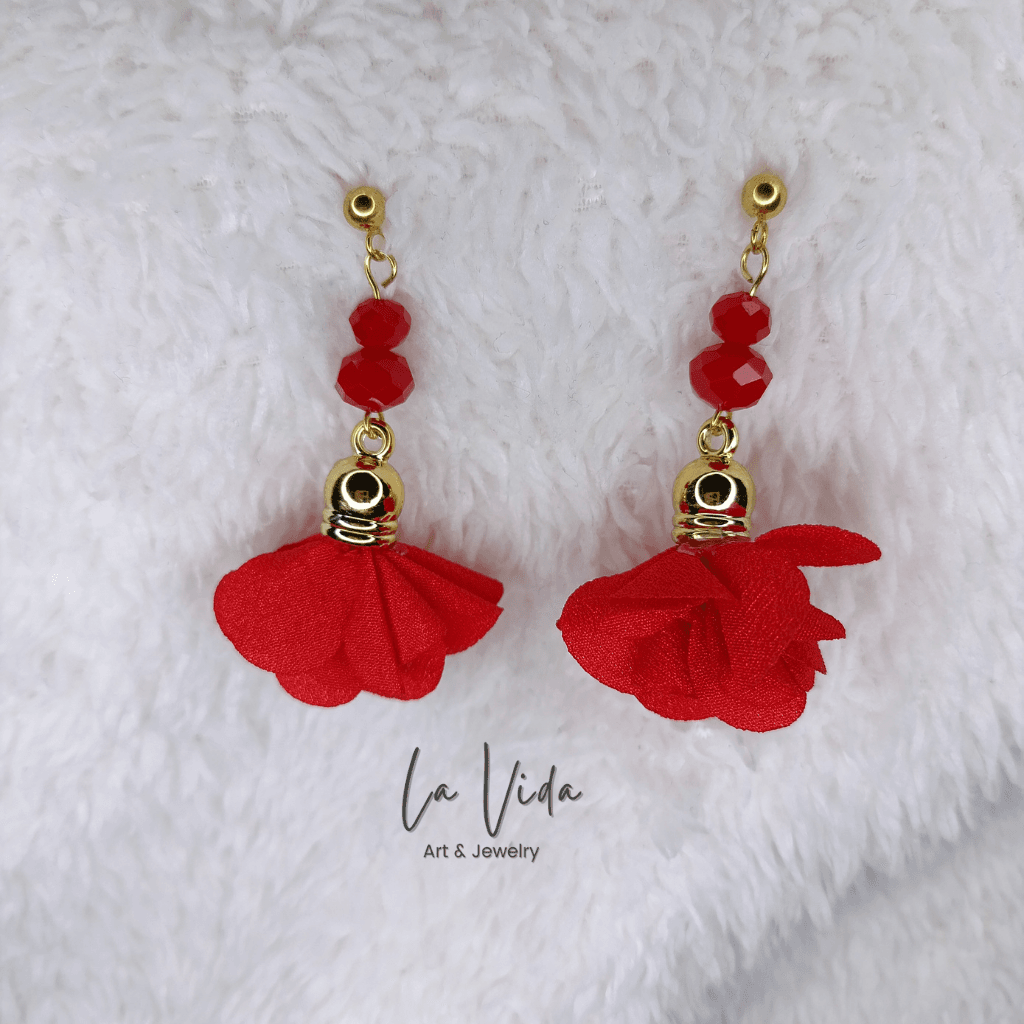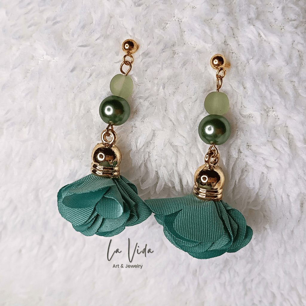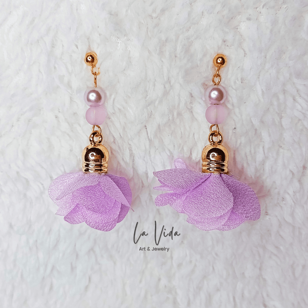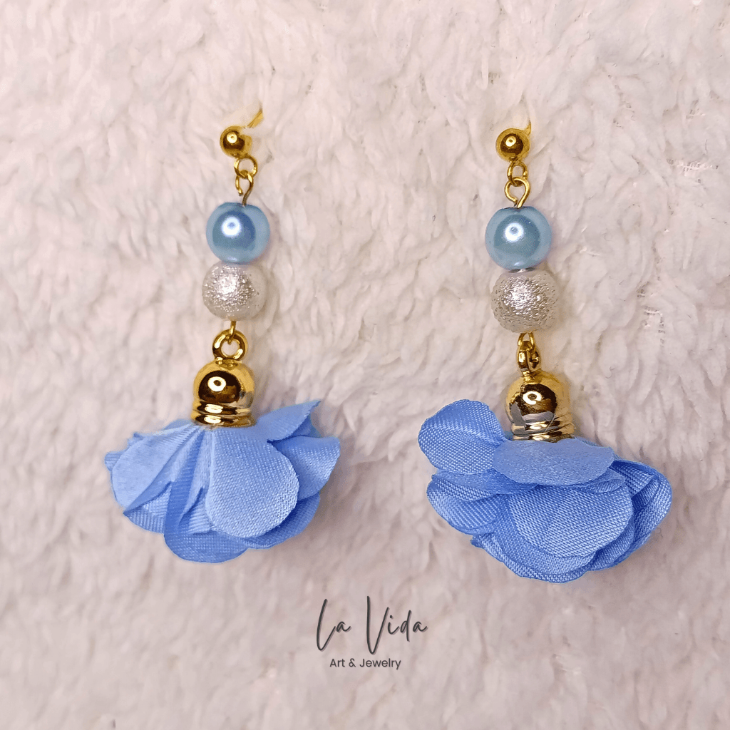 Ezek a fülbevalók virágbojtokkal és üveggyöngyökkel készültek.