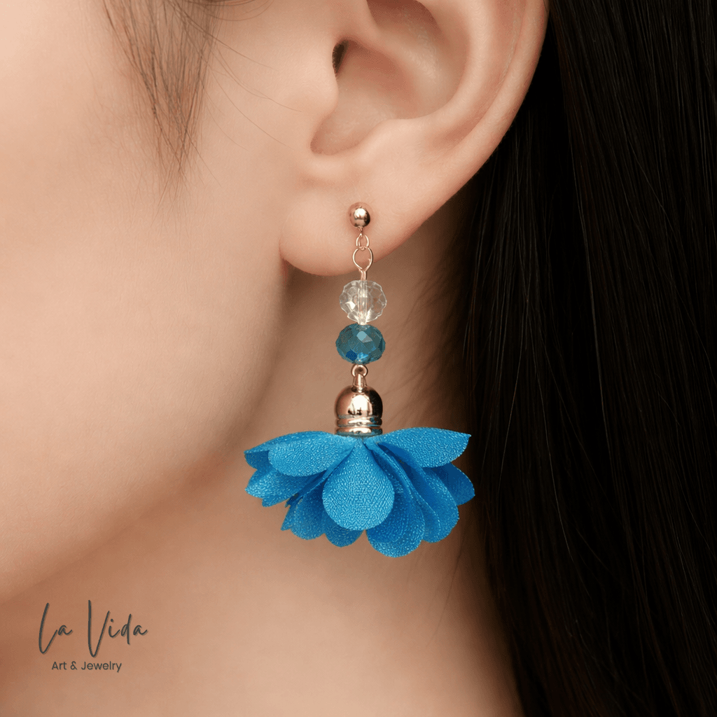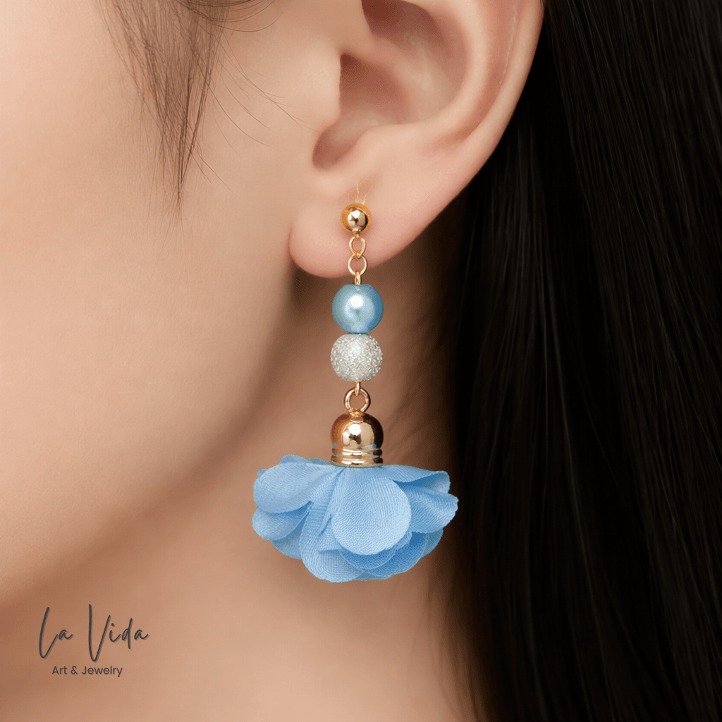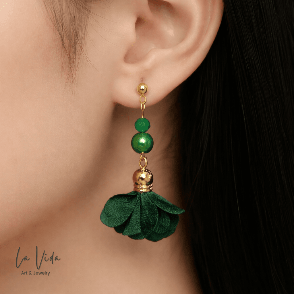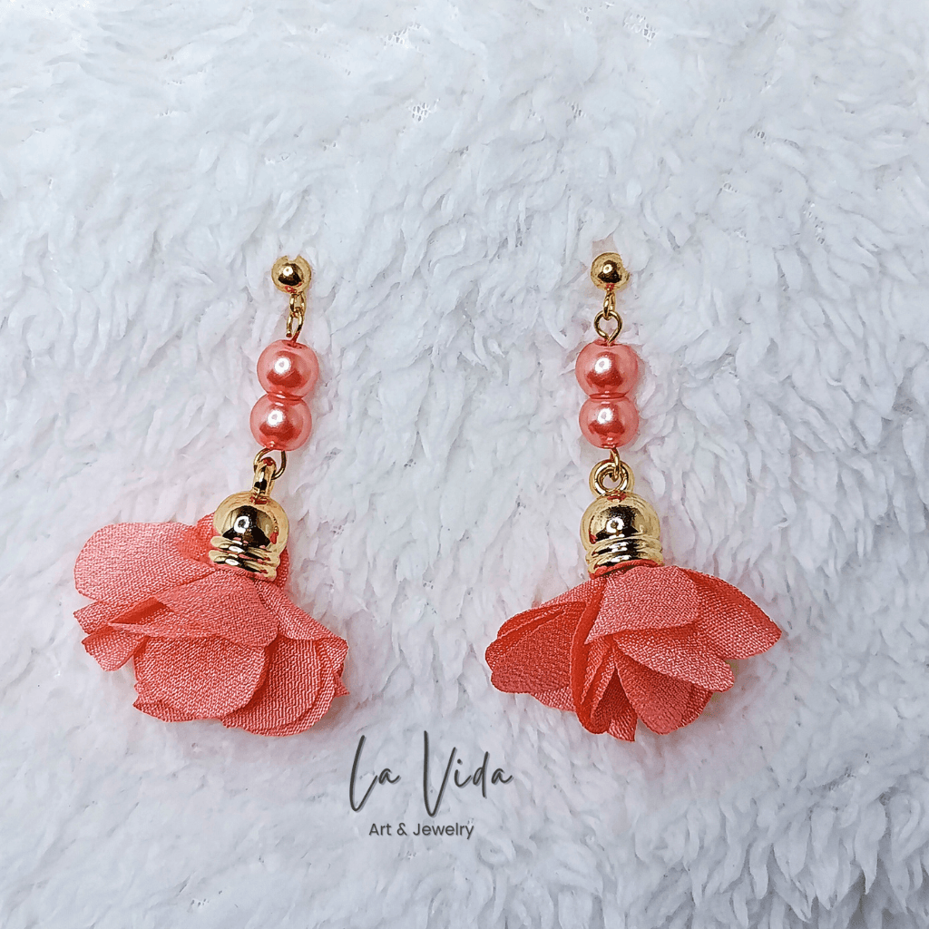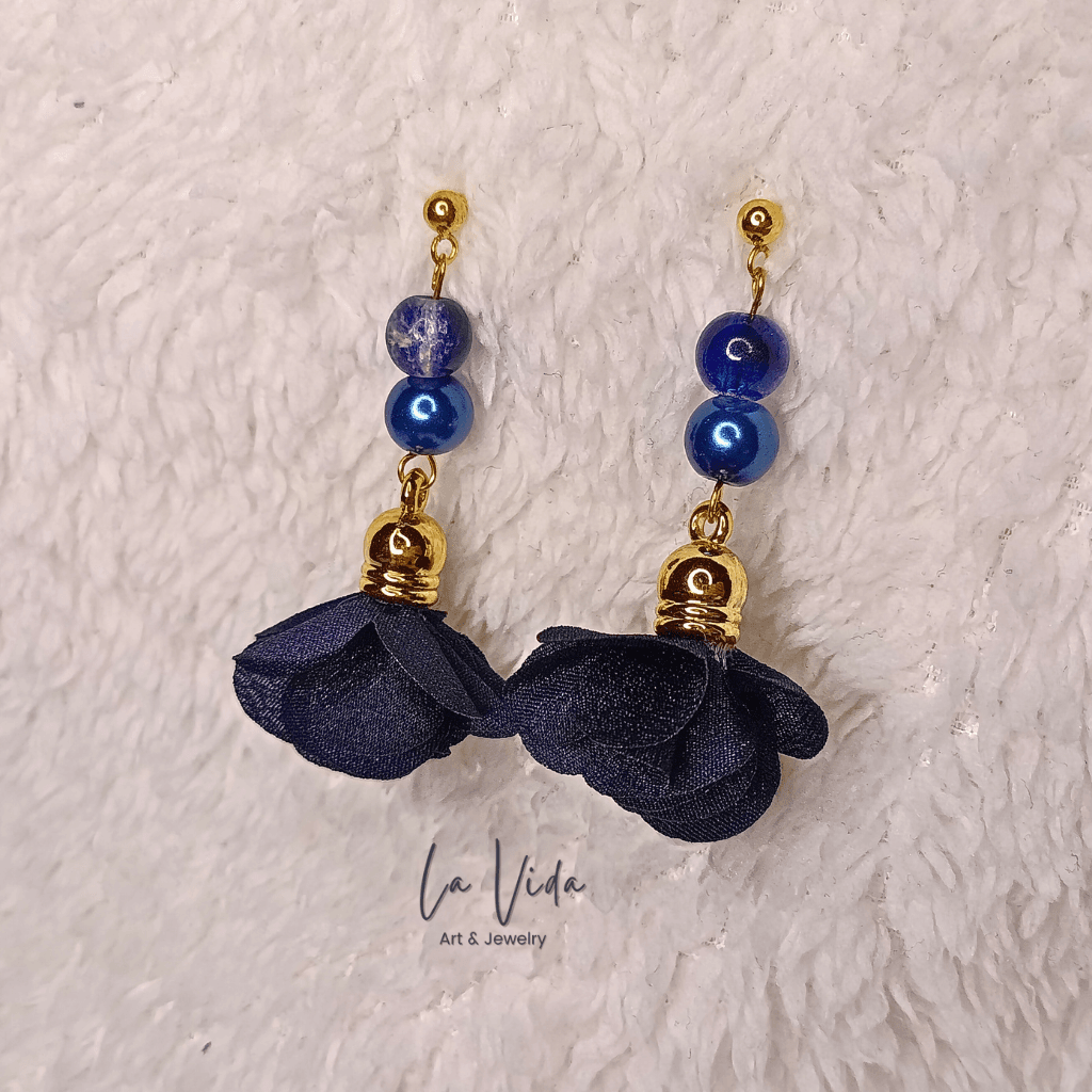 Ezek a fülbevalók virágbojtokkal és üveggyöngyökkel készültek.