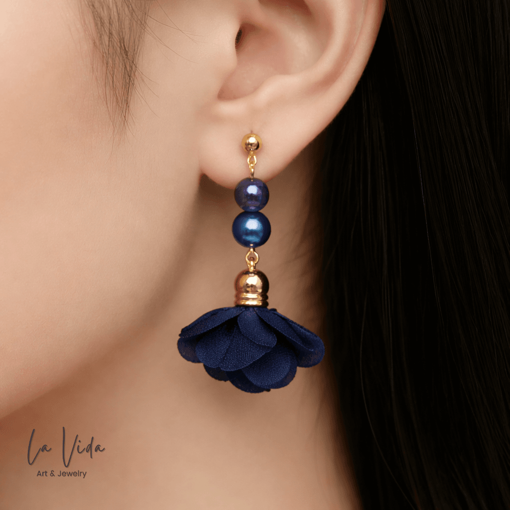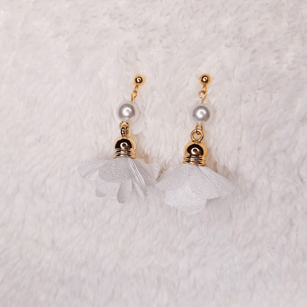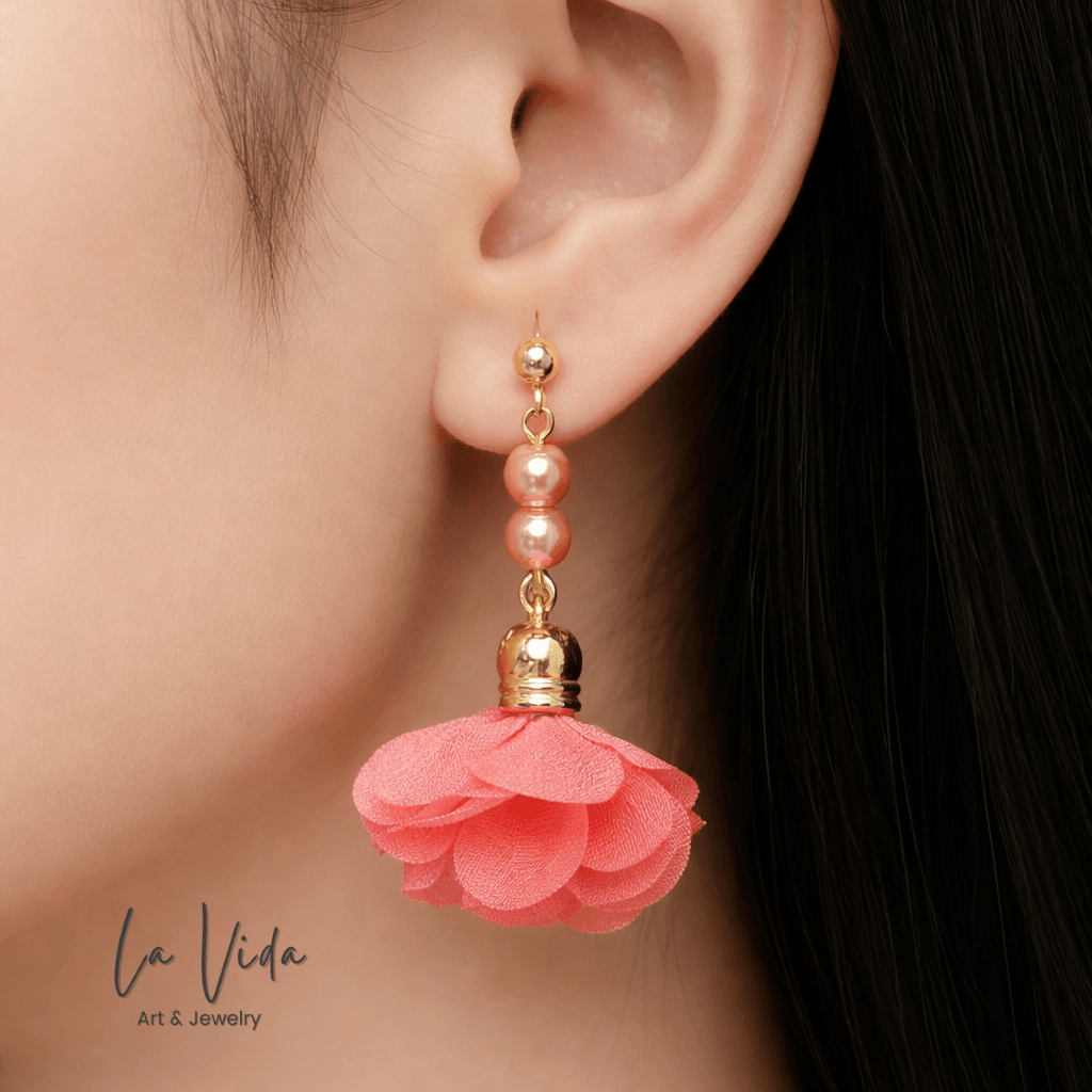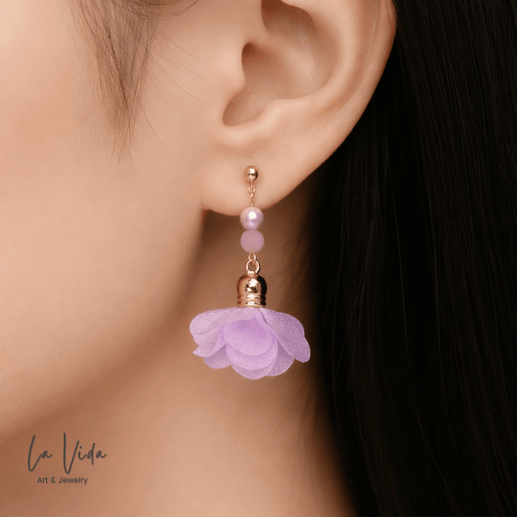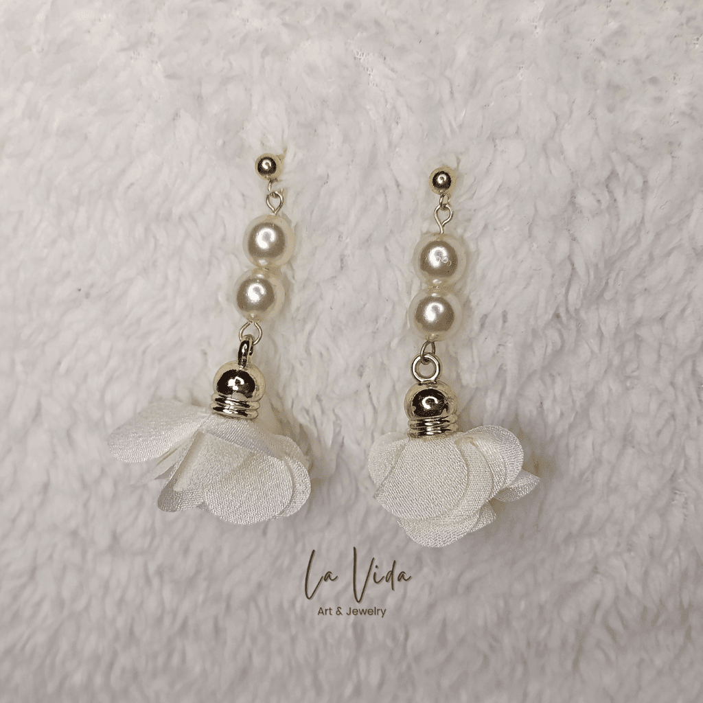 Ezek a fülbevalók virágbojtokkal és üveggyöngyökkel készültek.