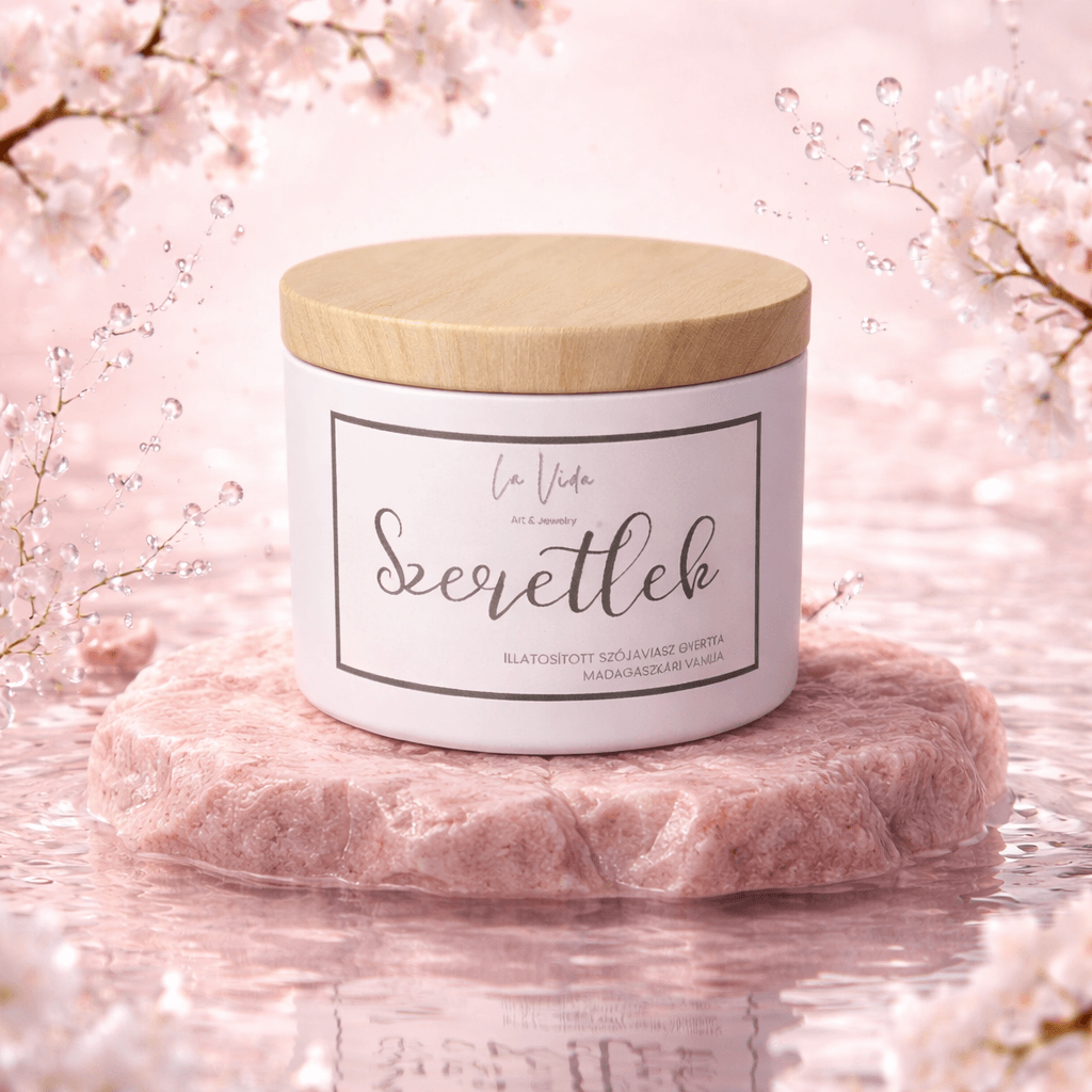 A la Vida Art & Jewerly termékei az eleganciát képviselik. Ezen elvek alapján készült a Szeretlek szójaviasz gyertya is. Letisztult designja, egyszerű, mégis stílusos megjelenése teszi lehetővé, hogy otthonunk, irodánk, üzletünk bármelyik részében méltón megállja a helyét. Dekoratív és divatos megjelenésű.  Legyen relaxálás vagy akár baráti beszélgetés kitünő megoldás, hogy dekoratív hangulatot teremtsünk egy Énidő gyertya meggyújtásával.